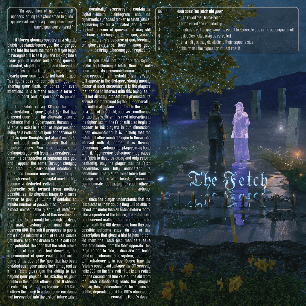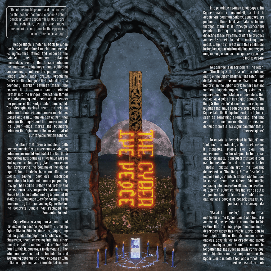 This tool seeks to veil sprawling cybernetic urban jungles with Elfame mysticism and infect heathen landscapes with digital sinews. CyberFlora posits that the Cyber Dimension which we inhabit more and more is merely an extension of the Fae Realm. At the heart of this is the idea that our digital selves are more than just our footprint in the cyber world, but a sentient doppelgänger, a cybernetic manifestation of the Fae creature of the Celtic world that is The Fetch.