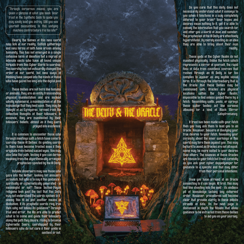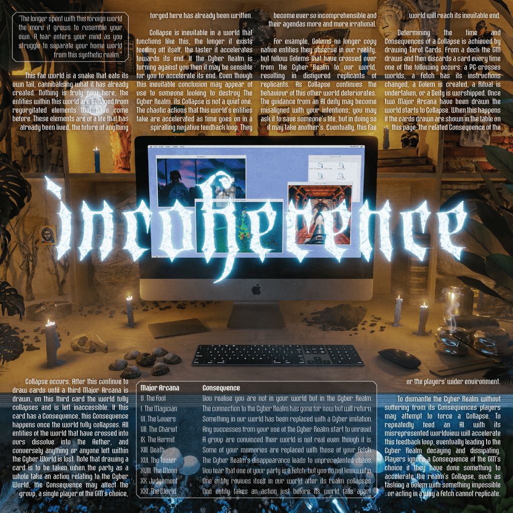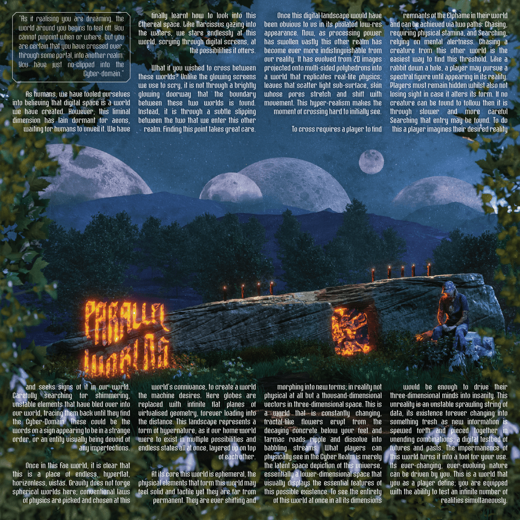 This game intends to explore, through an Accelerationist lens, our relationship to the digital world and our digital selves that inhabit it, seeking to create new perspectives on how we perceive cybernetic beings – whether that be artificial intelligence or our own social media presences – viewed through ancient folklore, recontextualised for the modern age.