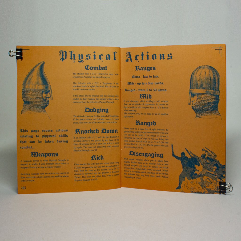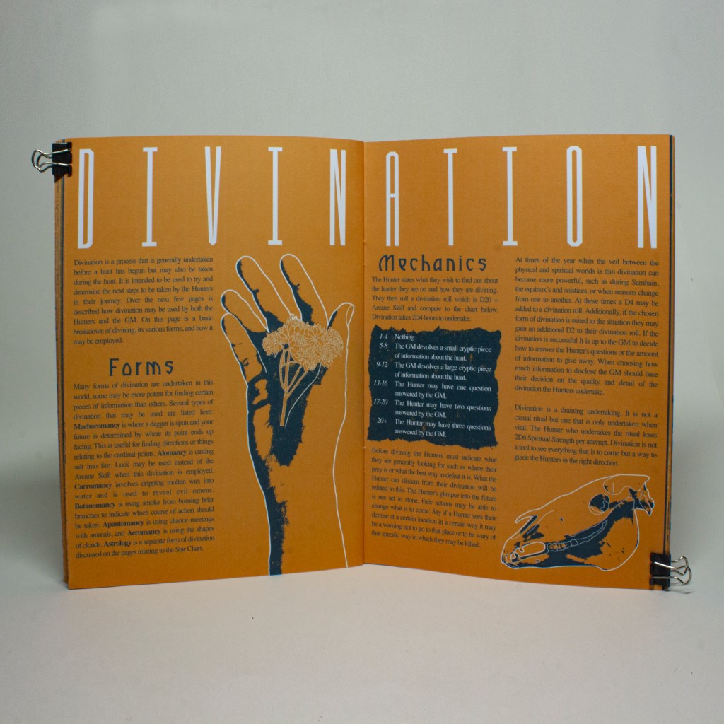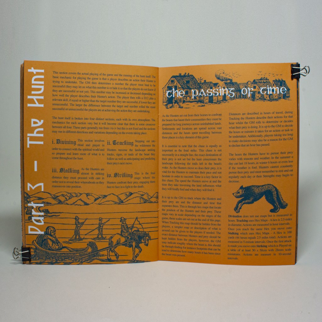 This game describes the four main stages of the hunt each with its own unique mechanics. Starting with Divination, the stage of ritual and offerings used to connect with the gods and glean what may be to come. Tracking where your hunters traverse the vast landscape seeking tracks, signs, or trails of the beast they follow. Stalking where your prey is in sight and you must move carefully and cautiously before you engage. And the final stage is, Striking where hunters confront their prey, engaging them face to face.